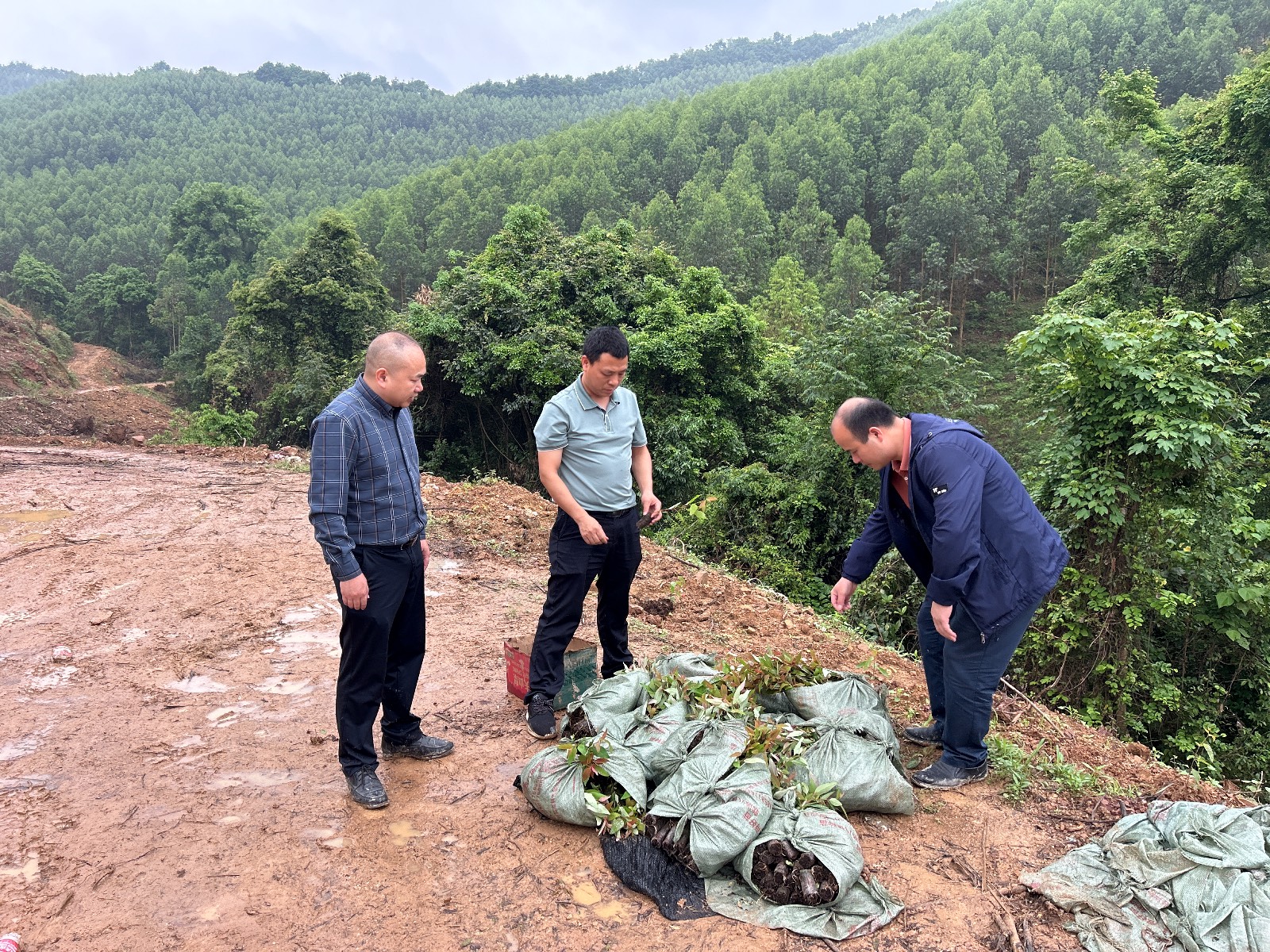 集团副董事长赵文东、、副总司理唐治良到鹿晟公司统领的三角林地检查施肥质量、、古盘林地指导造林事情